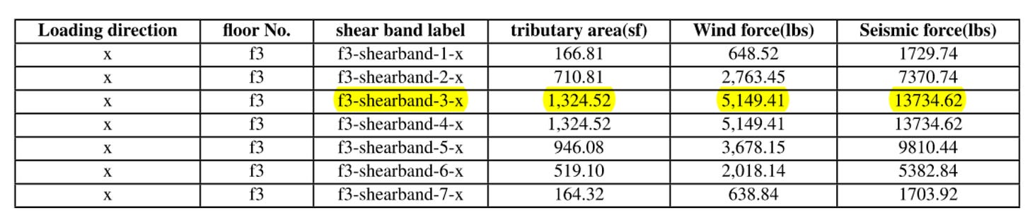Now that we have checked the seismic load distributions to each shear band are aligned, we want to further verify the load distribution to each shear wall.