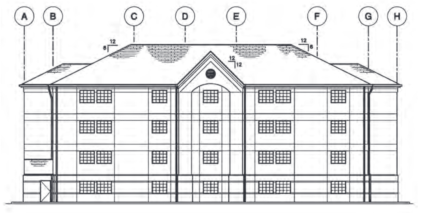 The SEAOC design example is a four-story wood-frame hotel structure assumed to be located in Irvine, CA at Longitude = -117.8320, Latitude = 33.6800, Zip Code 92614. The gravity-load framing system consists of wood-frame bearing walls. The lateral-load resisting system consists of wood-framed bearing shear walls (common box-type system). The building elevation is shown as above.