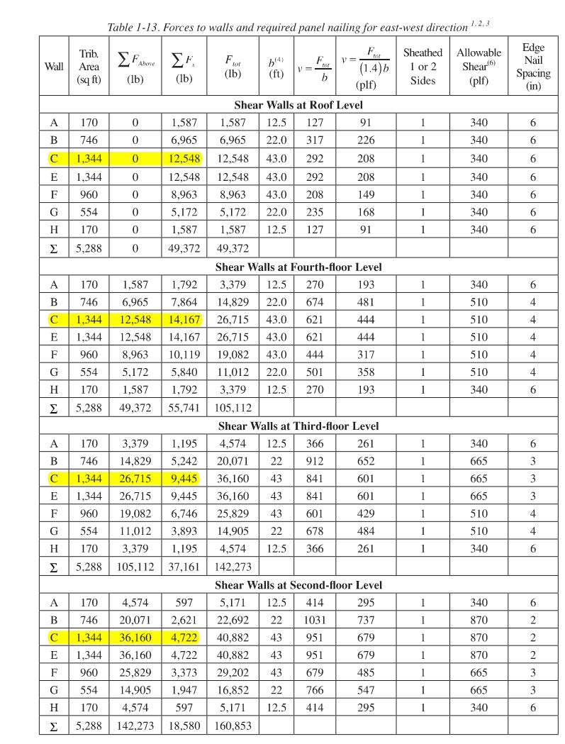 For SEAOC design, each shear wall within shear line C bears 951 × 21.5 = 20446.5 lbs
