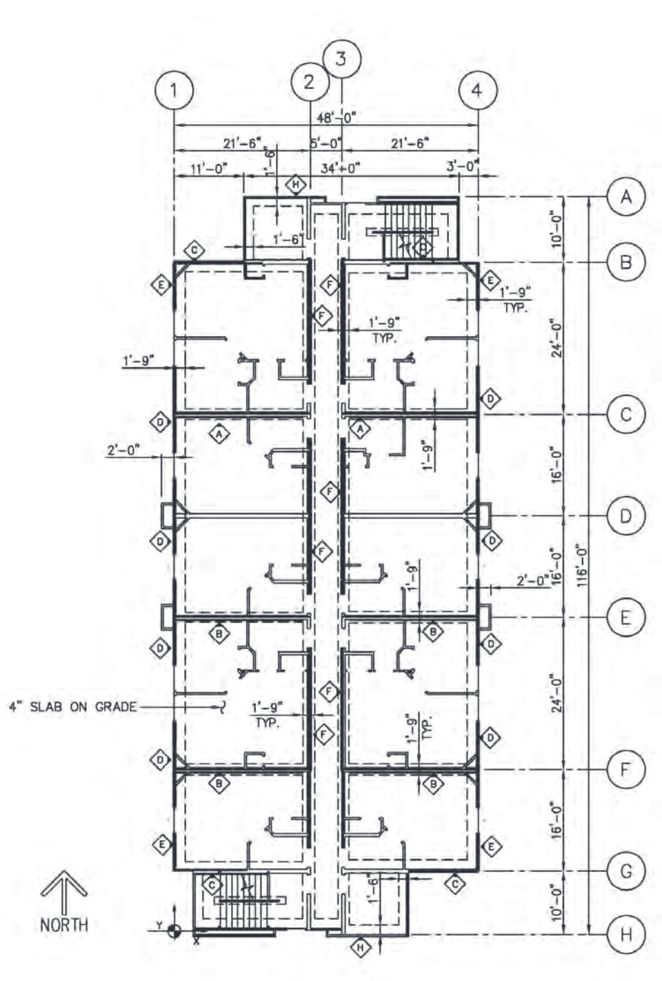 Since the design manual only provides a typical floor layout and the building structure looks the same for every floor from the side view, we make a reasonable assumption that the floor layout is identical across all four stories.