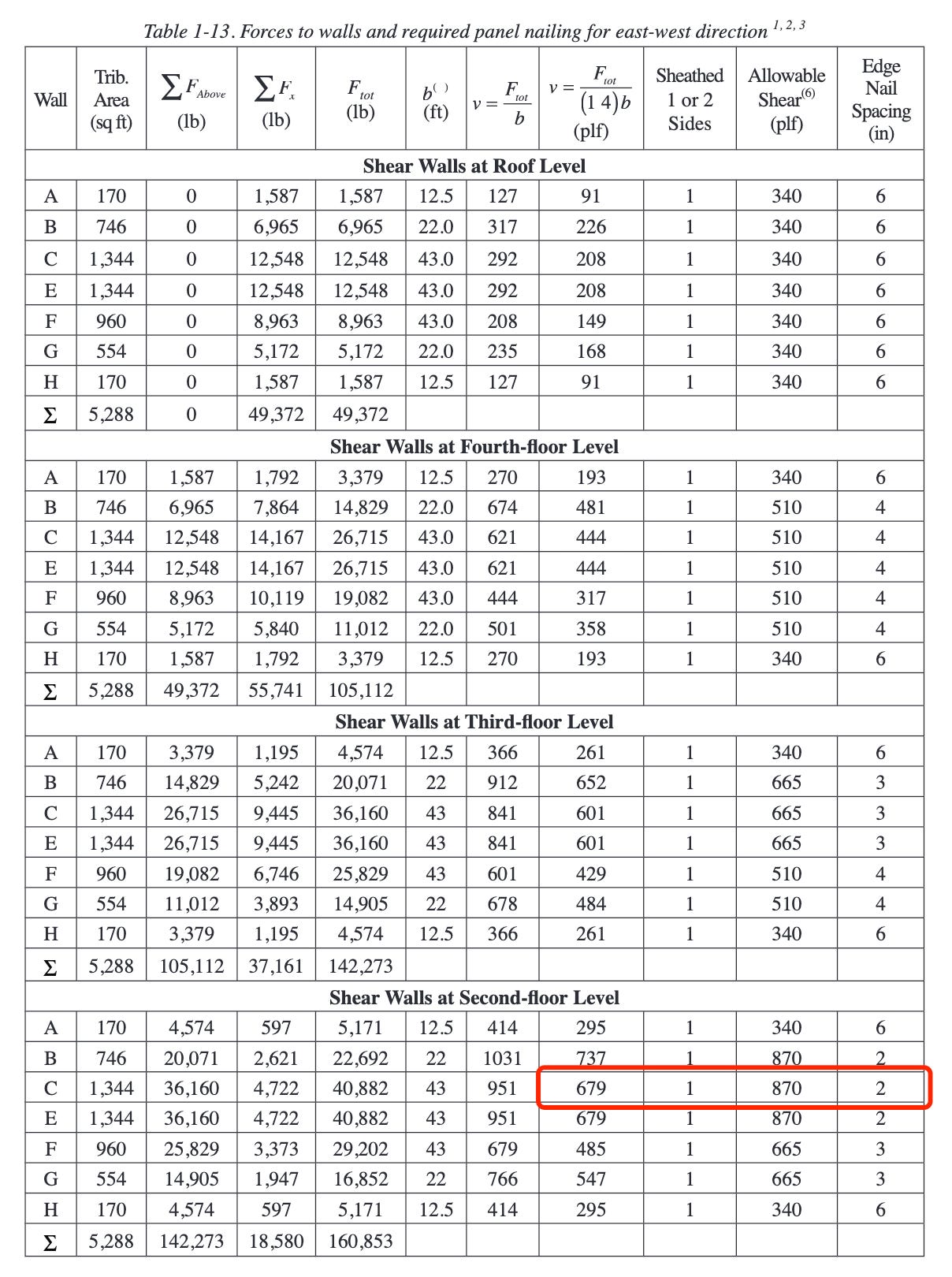 In Genia’s design, we opt for “S1_(2)15/32_10d@6,” which uses double sheathing and has the capacity closest to force demand. We understand that double sheathing might be more difficult to construct, which might explain why the SEAOC design prefers single sheathing with a more compact nailing pattern. When we launch our editor interface in the next release, we can open up this option to the end user and let structural engineers to make the decision.