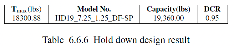 The SEAOC design chooses continuous rod system, so we cannot make a direct comparison here. Below is their calculations of the max uplift tension: