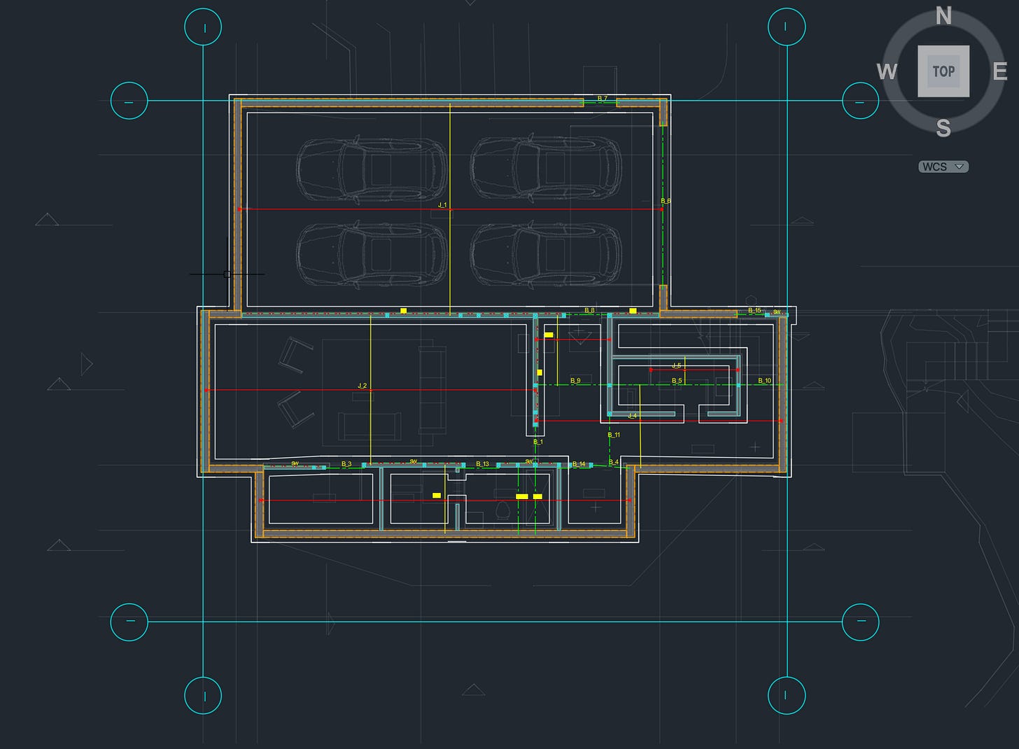For the Basement, the exterior walls form the shear wall system for lateral stability. Joists and beams are placed to support the above floors. A concrete strip footing is designed as the foundation system. (Note that in this sample project we didn't receive the geo-tech report at design time, so we had to make some basic assumptions about the soil condition.)