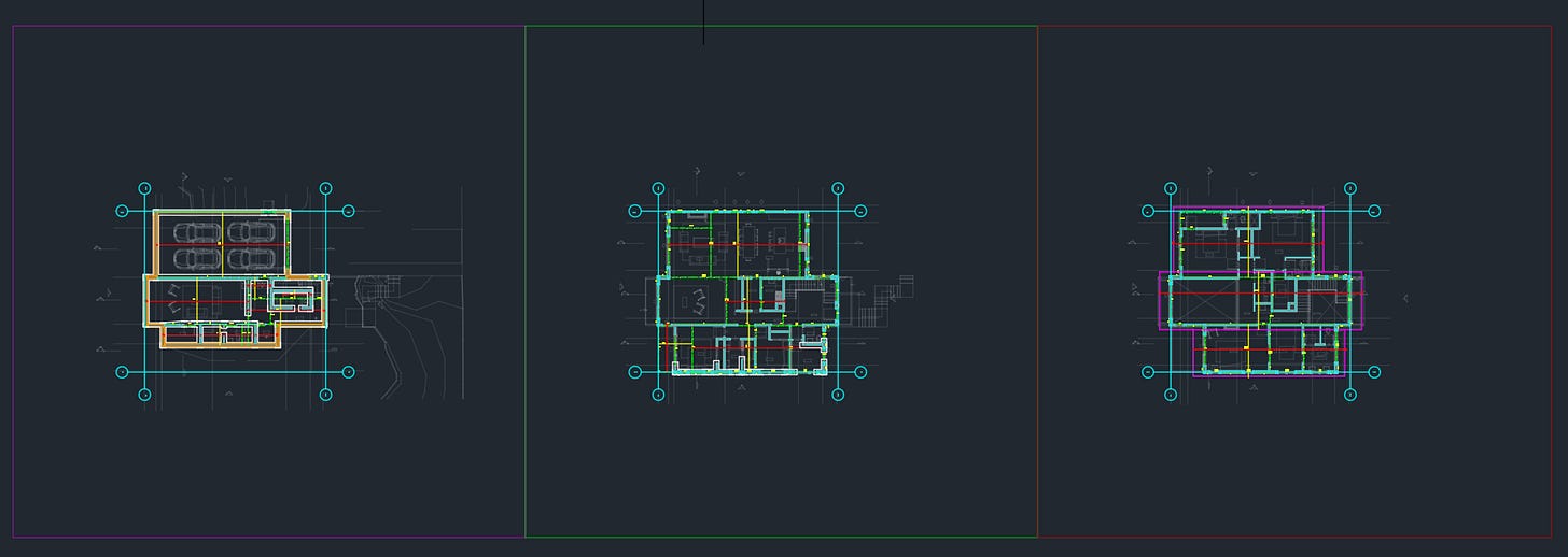 In the file, we place the structural plan of the three floors side by side, along with a legend block on the left. For all floors, the new structural design is placed directly on top of the original architectural drawing, whose elements are dimmed with a light gray color. Each floor is surrounded by a set of grid lines in cyan blue color to help with placement anchoring across floors.