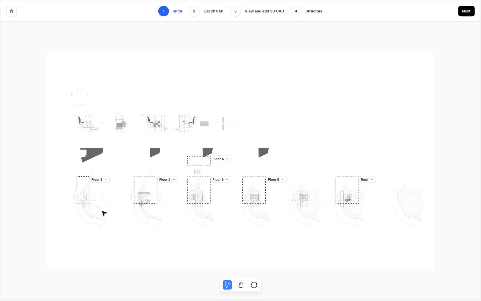 After a successful upload, Genia generates architectural models based on the floor plan. Its AI first performs segmentation to automatically identify potential floor plan areas within your DWG file. You will have a chance to review these segmentation results and correct any errors. You will be presented with bounding boxes overlaid on your drawing, which you can then confirm, modify, or delete to accurately define the perimeter of each building level.